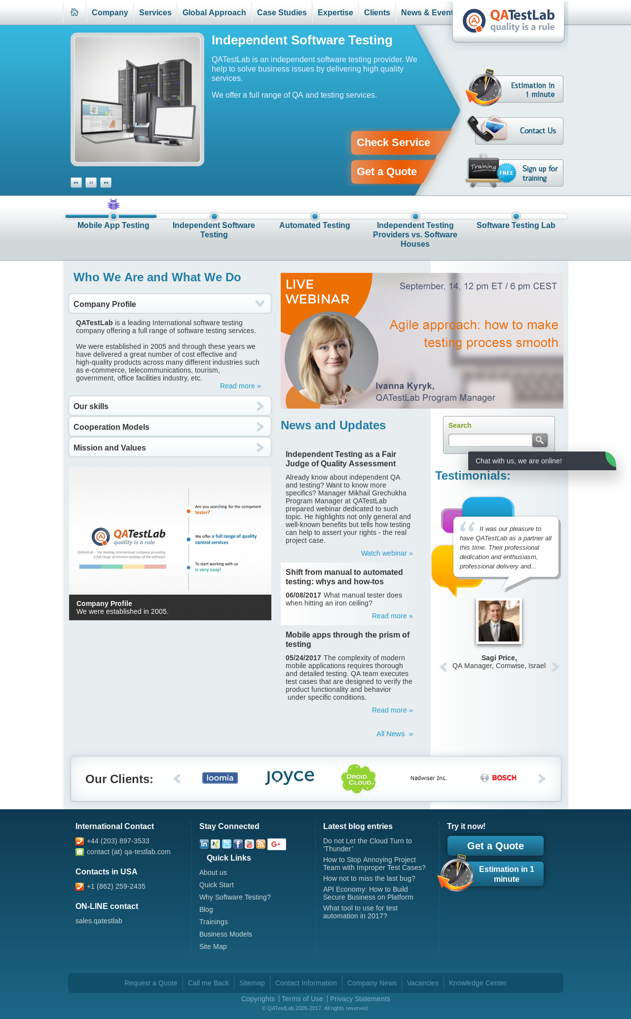 QATestLab is a leading international company offering a full range of software testing services. The company was established in 2005 and through these years we have delivered a great number of cost effective and high-quality products across many different industries such as e-commerce, telecommunications, tourism, government, office facilities industry, etc. Our core competence and our passion is the software testing but we offer a full range of QA services, including software quality consulting, test planning, test execution and software development process improvement:
