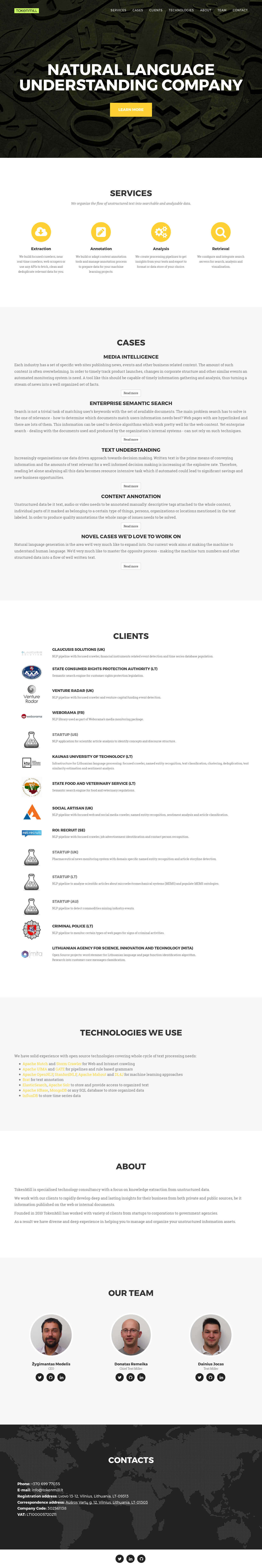 TokenMill is a linguistic engineering company focusing on providing text analytics and search solutions. Founded in November 2011 TokenMill has worked on a number of government and commercial projects. Our services are falling into three main areas: Natural language proceeding. One common NLP task is identification of various entities of interest within unstructured text: organisation names, disease symptoms, product features and a like. The other is various techniques of document grouping: finding similar documents, near duplicates, themes within the stream of text, etc. Crawling. To do NLP one needs to get to the data first. Textual data is usually acquired via web or intranet crawling. We do have the expertise needed to run large scale and focused crawls. Vertical search. Lastly all the collected and analysed data has to be accessed by the end users. Usually, it is done via specialised search engines which allow to run custom queries, rank documents according to business domain rules and provide other tools allowing to query and reason with otherwise inaccessible huge textual data. We provide solutions in those areas partially based on internally developed tools - which in turn are based on solid open source projects - as well as on custom development tailored for the needs of a particular client.