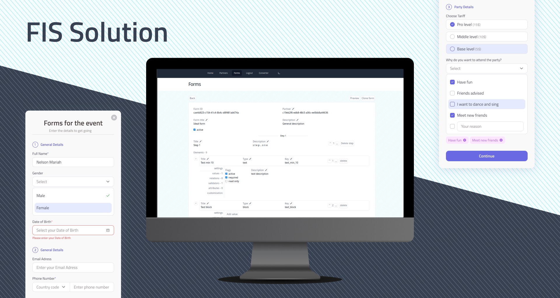 FIS Solutions needed to develop a form builder in PHP and implement a JavaScript widget that could seamlessly load forms on any third-party (partner) website and integrate them into their existing system.