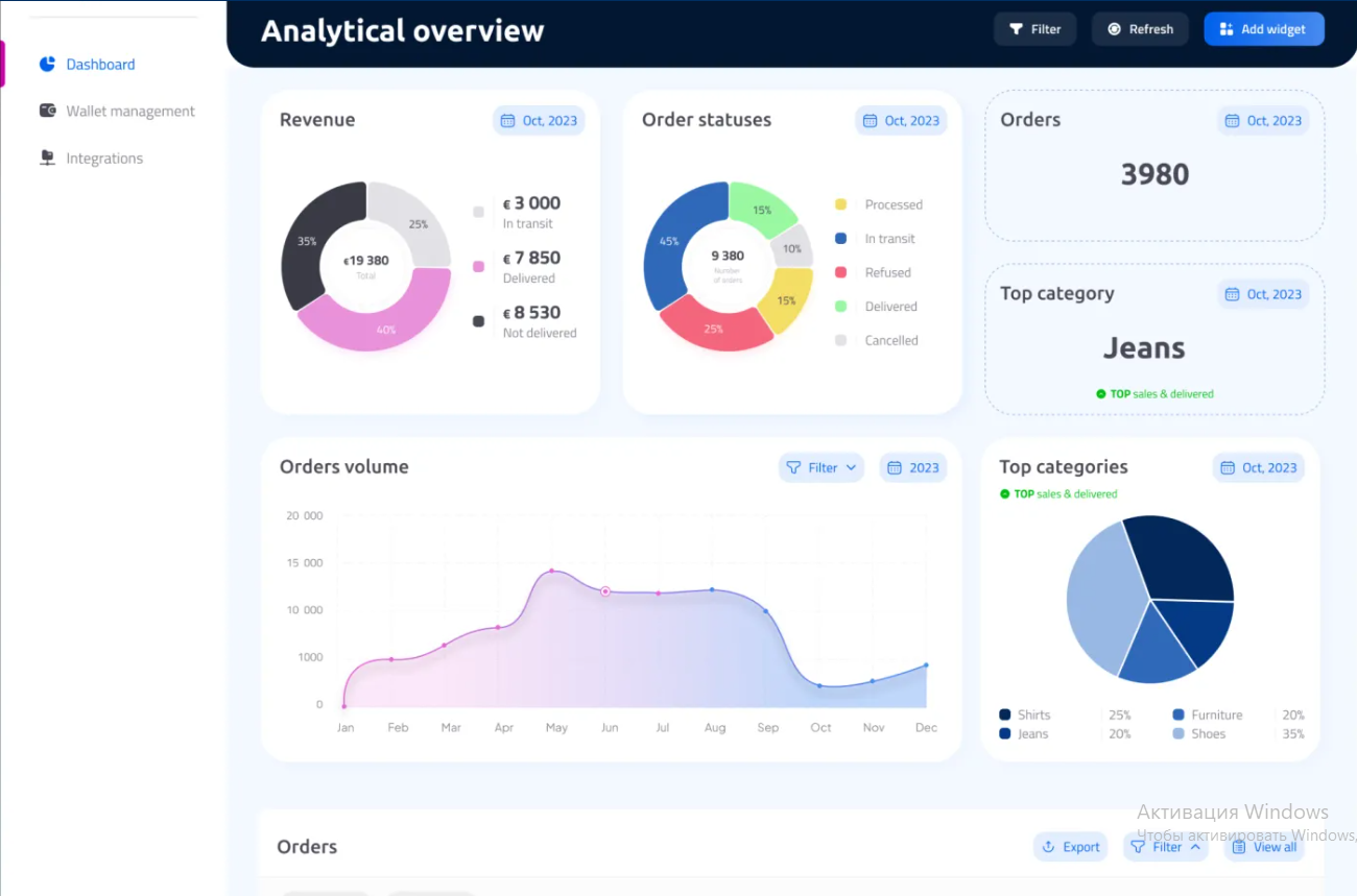 Seamless integration with clients' existing e-commerce platforms and implementation of cron queues for nightly updates. Retrieval of Shopify and WooCommerce store data to generate a user dashboard with order statuses, volumes, top categories, metrics on delivery, and more. Development of a revenue analysis process and delivery status tracking across multiple shipping companies. Creation of a feature that allows admins to calculate funds for specific shops and enables users to withdraw available funds. Introduction of an admin dashboard displaying key performance indicators (KPIs) such as total sales, orders fulfilled, and available funds per client. Business Value: The enhancements significantly improved the customer experience, making the services more comprehensive and effective. These changes have increased the number of clients and improved their Customer Satisfaction Index (CSI) and Net Promoter Score (NPS).