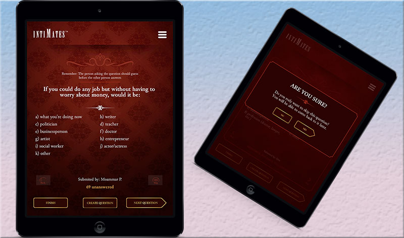 IntiMates is a mobile game for better communication and relationships for couples / families. It helps people to be more open in discussing important issues, feel relaxed and listen to their partner. In addition to predefined questions, users can submit their own ones to the app cloud for review. IntiMates is available on iOS and Android platforms.